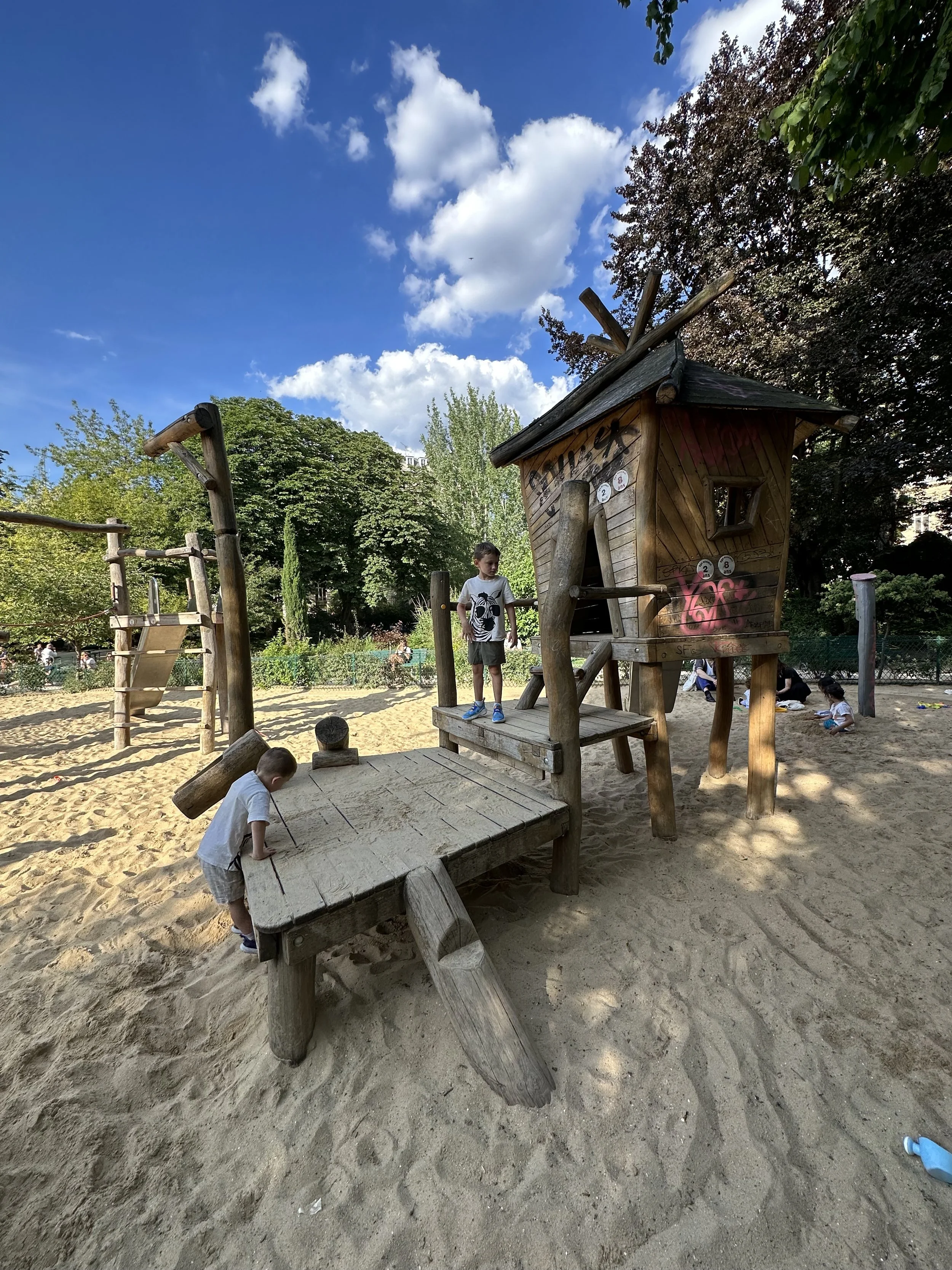 Square du Temple playground is located in a nice neighborhood with lots of great lunch spots around. The playground has sand, wooden houses and misters.